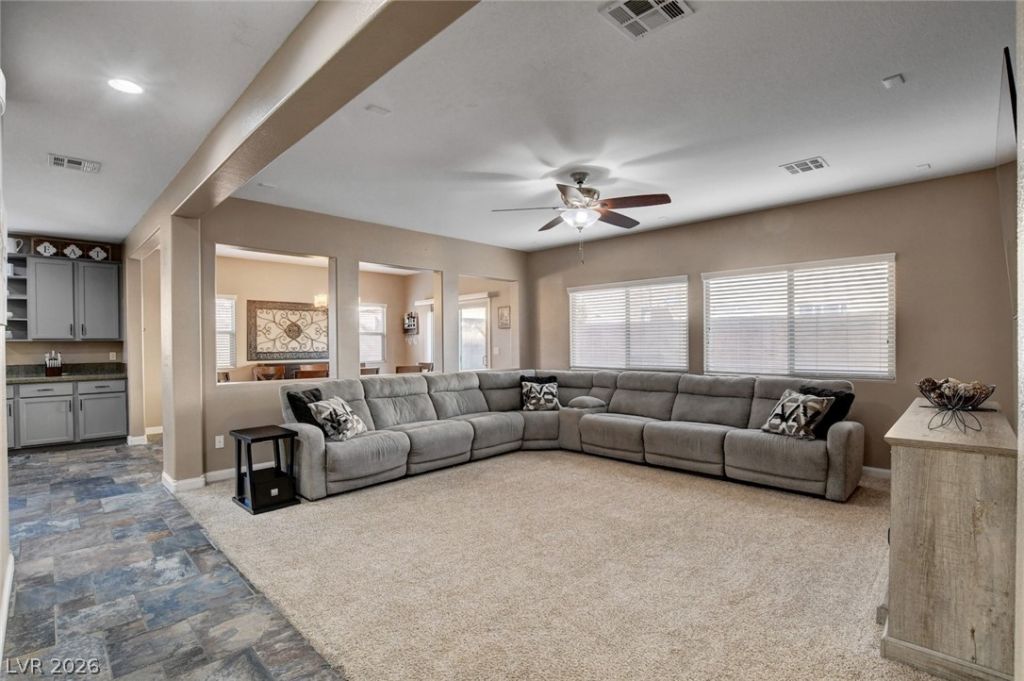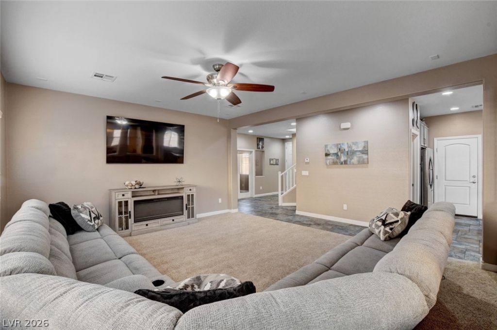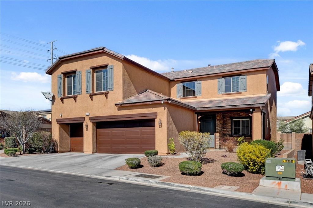 This stunning almost 3,000 sq ft residence perfectly balances expansive, open-concept grandeur with thoughtfully placed private retreats. Featuring 5 bedrooms and 3 full baths, the versatile floor plan includes a main-floor suite, ideal for multi-generational living or a secluded guest wing alongside an enclosed den perfect for a home office. The heart of the home is a chef-inspired kitchen boasting granite countertops, island, and a walk-in pantry, flowing effortlessly into the dining and family areas. Upstairs, the primary sanctuary is separate from 3 additional bedrooms and a sprawling loft, offering space for gaming or lounging. Practicality meets style throughout, from the rare 3-car garage with ample storage to the low-maintenance desert oasis outside, complete with synthetic turf and a dedicated dog run. Nestled near the base of the Las Vegas mountains, you are just minutes from scenic hiking trails, premier shopping and easy Beltway access.